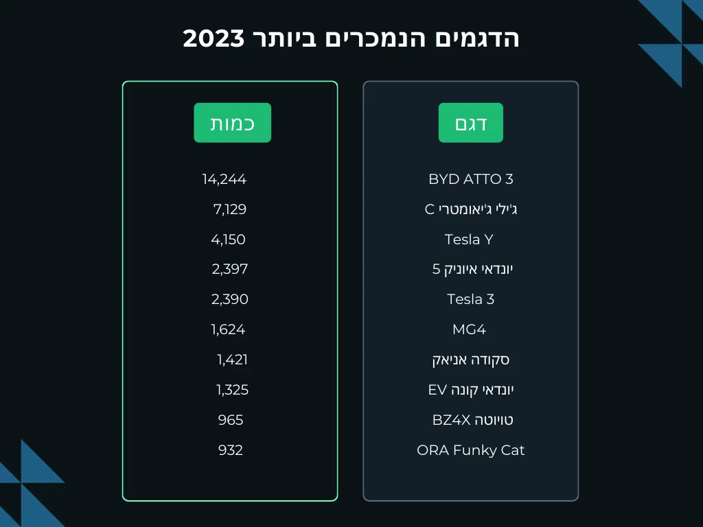 הנה הרשימה המלאה של עשרת הדגמים החשמליים הנמכרים ביותר בישראל לשנת 2023.